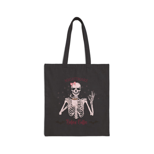"Nightmare Before Coffee" Skeleton Drinking Coffee Halloween Shirt with Pink Bow | Cute & FunnyCotton Canvas Tote Bag