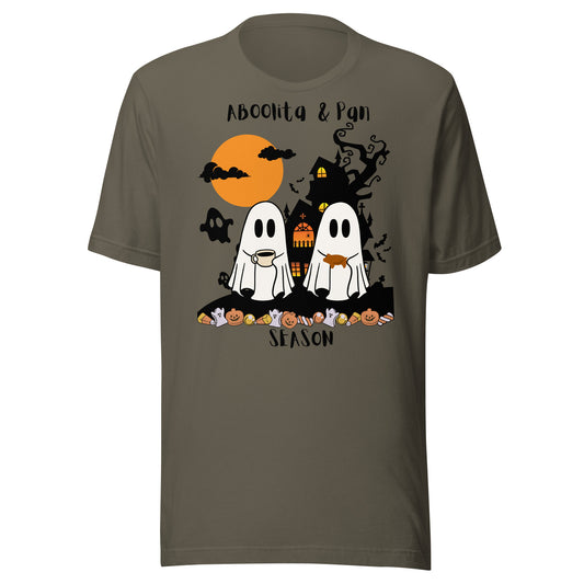 ABoolita & Pan Season T-shirt – Ghosts Drinking Abuelita's Hot Chocolate and Eating Pan Dulce at a Haunted House