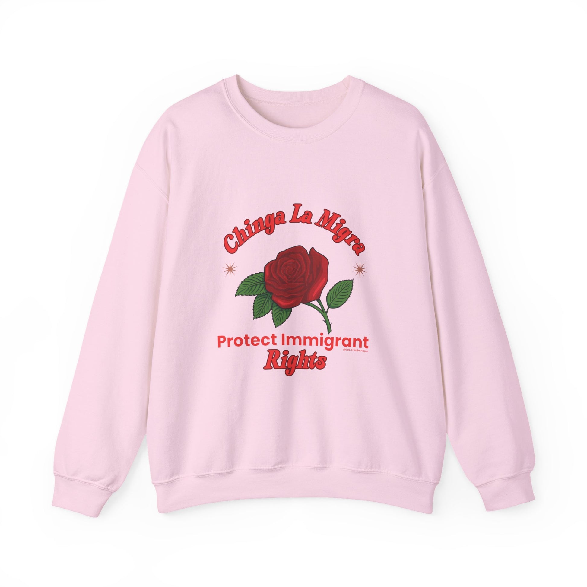 Raise your voice with style. This premium Unisex Sweatshirt from our Nuestra Voz collection features a striking red-rose graphic and the unapologetic call to “Chinga La Migra / Protect Immigrant Rights.”